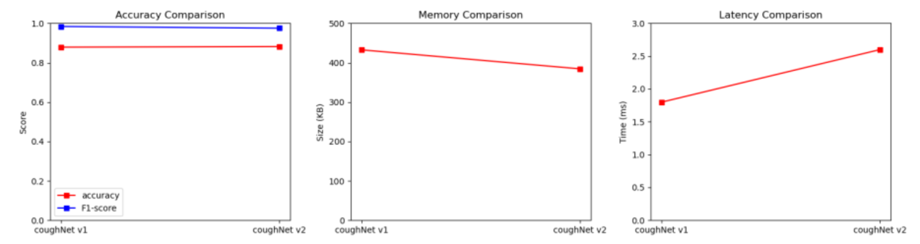 In my work I explored the trade-off between using a pure 1D-CNN (CoughNet1) and a hybrid 1D and 2D-CNN (CoughNet2) architecture. Both were trained using Quantization Aware Training (QAT) on 20 classes (Cough class + 18 Keywords + Unknown) for 100 epochs. The best model depends on the final application resource constraints. While both models reached similar accuracy after tuning, they differed in inference latency, size, and energy consumption per inference. The pure 1D-CNN was faster, used fewer operations per inference (lower power), but had a larger memory footprint.