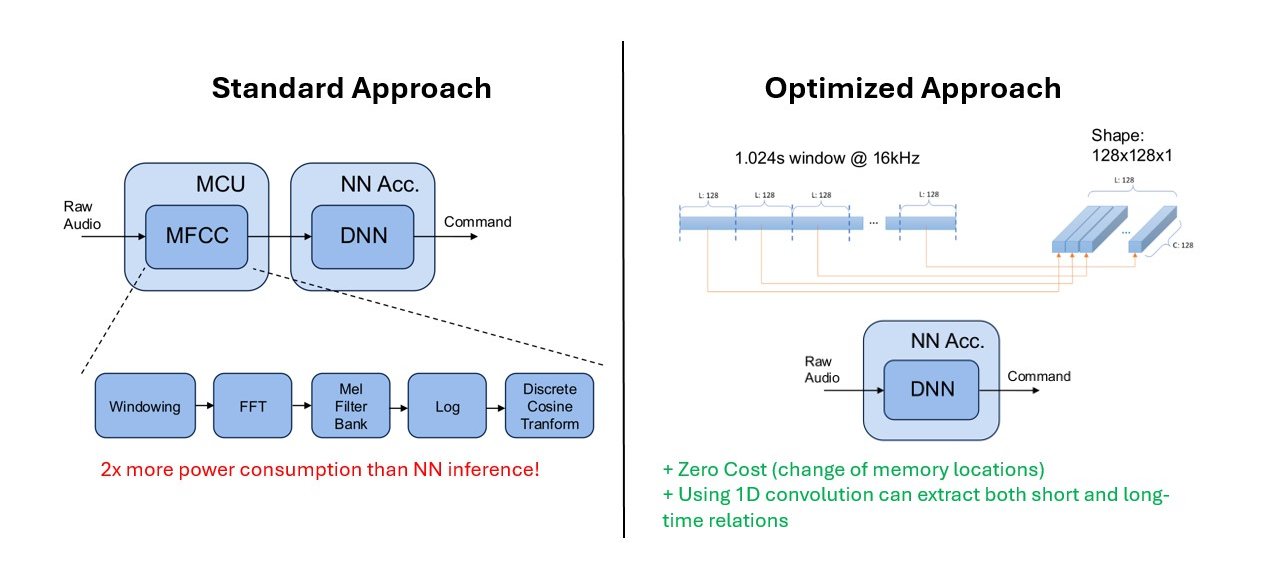 The core innovation of CoughNet lies in its hardware-optimized architecture. While traditional audio classification relies on MFCC (Mel-frequency cepstral coefficients) for feature extraction, this process can consume over 2x more power than the actual neural network inference.