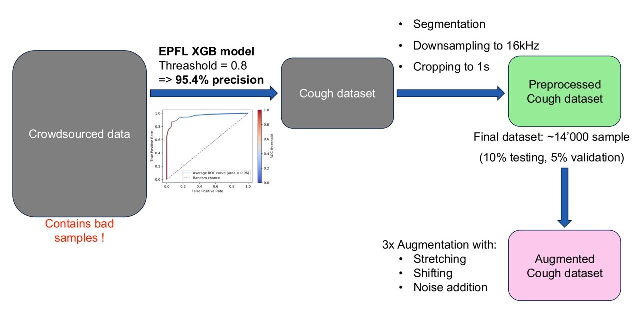 The model was trained on the COUGHVID crowdsourcing dataset from the EPFL Embedded Systems Laboratory, featuring approximately 30,000 samples. A pre-existing model was used to remove noisy or low-quality samples common in crowd-sourced data. Then, I applied downsampling to 16kHz to optimize memory usage while preserving key spectral information in the signal, segmentation to keep only the parts of the signal were there is a cough sound using standard signal processing, cropping into 1s overlapping windows, and finally augmentation by stretching, shifting and adding different background noises.