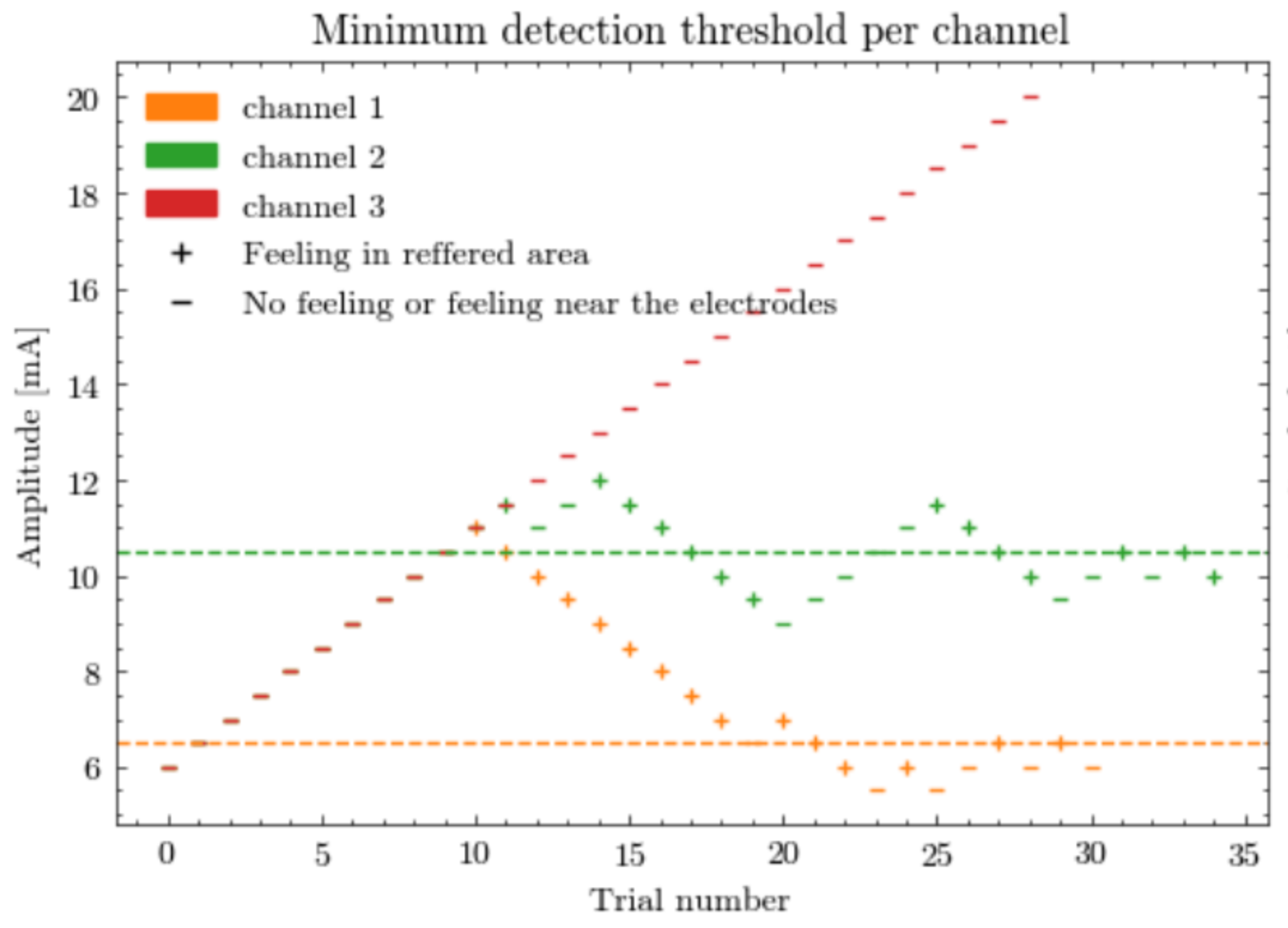 Calibration: The calibration step consists in tuning the stimulation parameters for each stimulation location to understand and improve the evoked sensation. The most commonly performed experiment is to generate a psychofunction for detecting the minimum threshold.