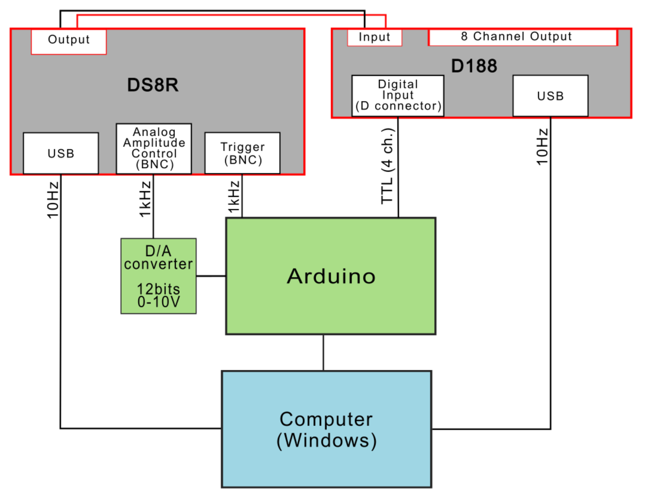 - Arduino code to transform the computer commands into specific trigger sequences, as well as to use the analog amplitude control on the device for a faster response time.